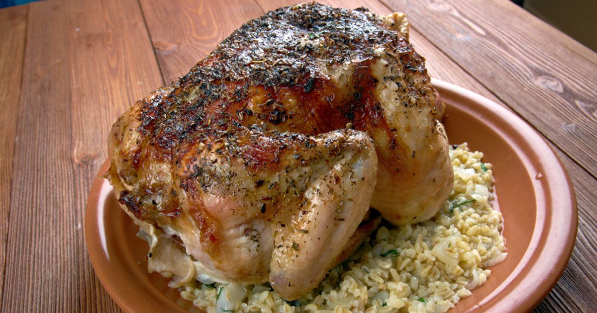 8- أدخلي الصينية إلى الفرن لساعة ونصف حتى ينضج الحمام. اسقي الحمام بالمرق من وقت إلى آخر.
