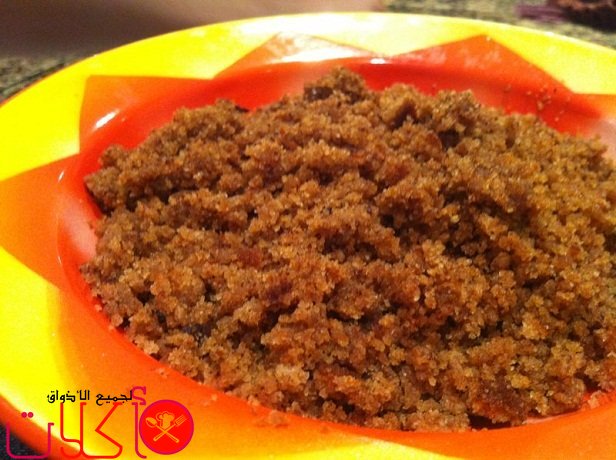 ٦-في وعاء كبير نضع العجينة المفتفتة مع التمر ونصف كمية الزبدة ونخلطهم باليد خلطا جيدا.