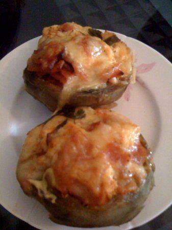 - ثم ترص فى صينيه وتحضرى صلصة الطماطم المسبكه على النار وتقومى بوضع معلقتين كبيرتين على كل حبة خرشوف فوق اللحمه ثم الجبنه المتزاريلا مع قليل من البقدونس .