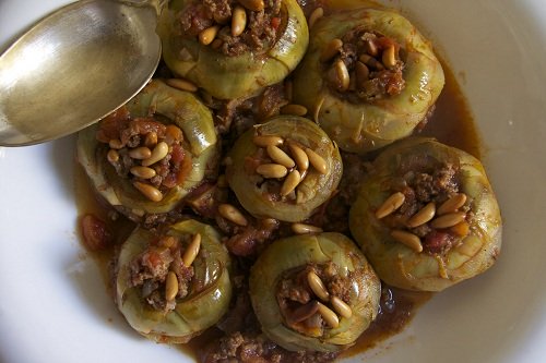 7-تحشى حبات الخرشوف باللحم وتوضع فوق صلصة الطماطم في صينية الفرن على حرارة 180 لربع ساعة ثم يخرج ويقدم مع الرز.
