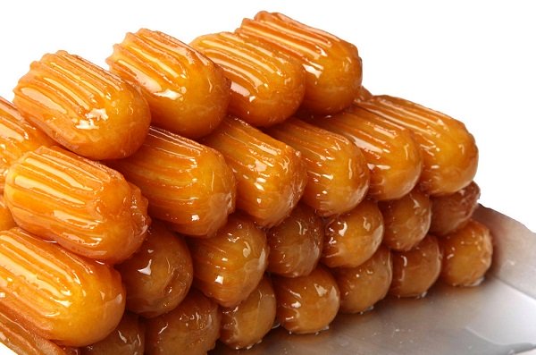 4. نصفي بلح الشام من الزيت جيداً ونضعه وهو ساخن فوق القطر البارد مباشرة ونغمره ونتركه قليلاً حتى تمتص جميع القطع من القطر وبعدها نصفيها من القطر وتصبح جاهزة للتقديم .