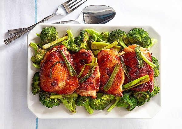 الدجاج بالبروكلي بالفرن ، و يشير تعبير الماهوغاني إلى خليط من صوص الصويا والعسل والذي يمنح غلاز الوصفة لوناً غنياً ونكهة كراميلية. طبق من أفخاذ الدجاج المحمصة في الفرن مع زهرات البروكلي الصحية.