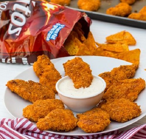 7- نخرج الدجاج بالدوريتوس من الفرن ونصفه في طبق ويصبح جاهز للتقديم