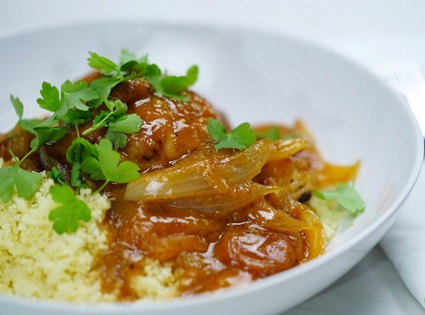 الدجاج بالمشمش ، وصفة الدجاج بالمشمش ستكون من الوصفات الجديدة والمفضلة لدى العائلة وهي تحتوي على أفخاذ الدجاج والكسكس والبهارات المغربية الشهية بالإضافة إلى النكهة الغنية لعصارة المشمش .