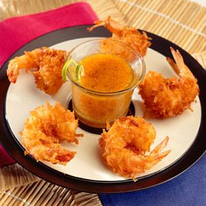- تغلف كل قطعة من الروبيان بالطحين (الطبق الأول) ثم بالصلصة ( الطبق الثالث ) ثم بخليط جوز الهند (الطبق الثاني )