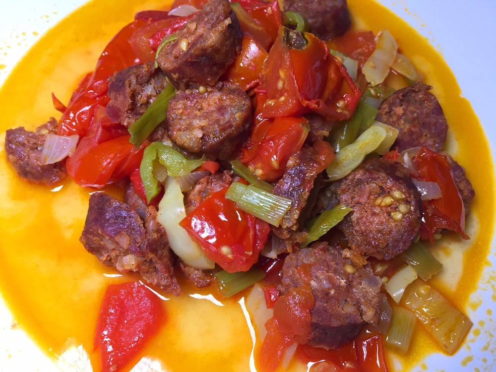 - اضيفي البصل و الطماطم الى السجق و قلبي ثم اخفضي درجة الحرارة و اتركيه حتى ينضج.
