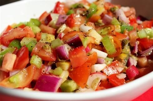 – توضع جميع المكونات في طبقٍ ويضاف لها الفلفل والملح والخل.