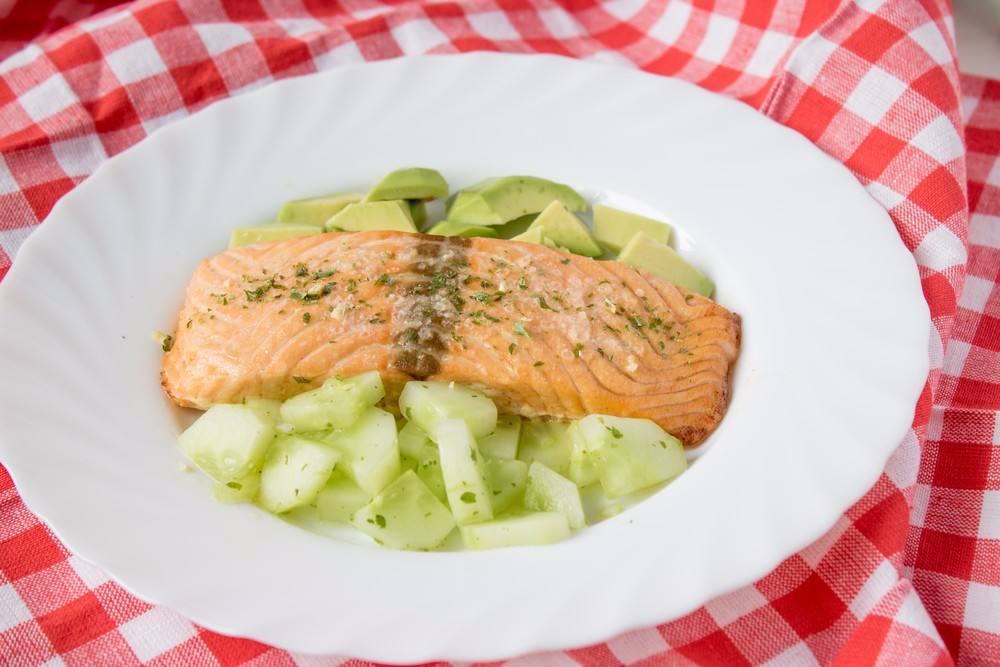 - قدمي السلمون مع سلطة الخيار و الأفوكادو بالمايونيز.