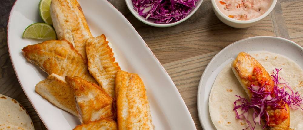 9. ضعي قطعة سمك واحدة في كل شريحة تورتيللا.