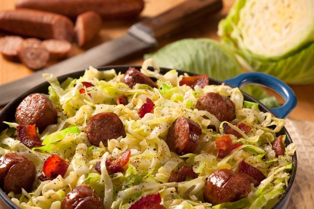 - ضعي حلقات السوسيس على مزيج الكرنب و قلبي ثم غطي المقلاة مرة اخرى و اتركيها لمدة من 10-15 دقيقة.