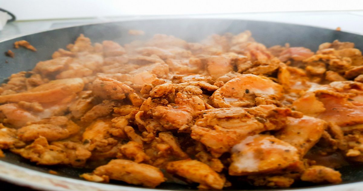 4- في مقلاة واسعة على النار حمي الزيت النباتي وأضيفي شرائح الدجاج. اتركيها على نار متوسطة حتى تنضج مع التقليب المستمر.