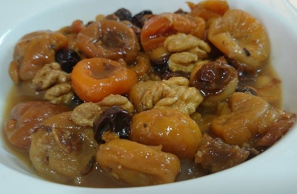 3. نصفي المشمش المنقوع و نضيفه إلى اللحم، ونقلبه لمدة 3 دقائق.