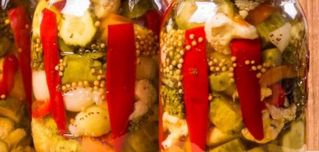 - نحشو عدداً من حبات الخيار بالحشوة، ثم نرصها في وعاء زجاجي معقم جيداً، ثم نضيف كمية من الخضرة المسلوقة، مع شرائح من الليمون.