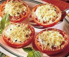 - تقطع الطماطم نصفين ونفرغها من البذور ثم نضع معها الزبادى ونرش الريحان والبقسماط والجبنة .