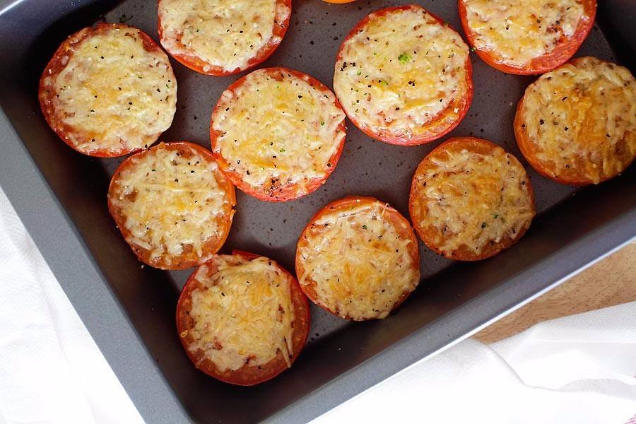 - ضعي الجبن البارميزان فوق الطماطم بالتساوي.