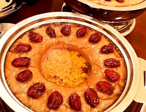 - نضع المزيج في وعاء التقديم ونزينه بالعسل والتمر وبذلك تكون العريكة جاهزة للتقديم .