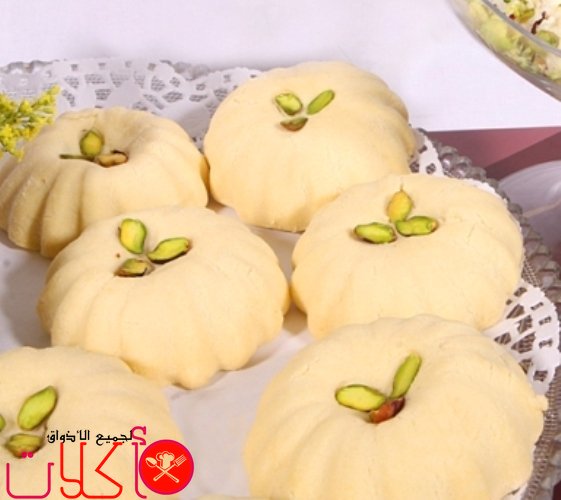 - – نضع حبتان من الفستق الحلبي اسفل قالب الغريبة المزين ونضع فوقه العجينة ونقلبها ونصفها في صينية مدهونة بالقليل من الزيت النباتي