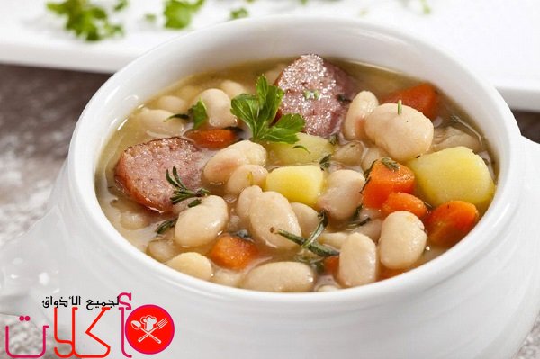 الفاصوليا البيضاء بالسجق ، شوربة الفاصوليا البيضاء غنية بالنكهات فهي تحتوي على الخضار الملونة مثل الجزر والفليفلة الحمراء والصفراء إضافة إلى السجق الذي يضيف مذاقاً مميزاً للفاصوليا .