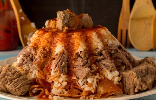 - نضع في طبق التقديم طبقة من الخبز ثم الأرز ثم اللحم ونزين بصلصة الطماطم .