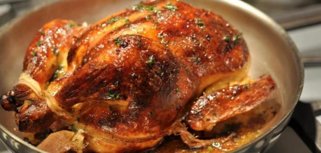 - نسخن الفرن على درجة حرارة 180 درجة مئوية، ونضع الدجاجة فيه، ونتركها لمدة لا تقل عن ربع ساعة حتى تتحمر من كافة الجهات، ويصبح لونها مائلاً إلى البني الغامق.