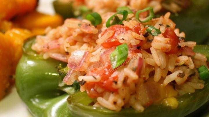 - ضعي خليط الأرز في الفلفل المقطع نصفين ثم ضعية في الفرن لمدة 5 دقائق.