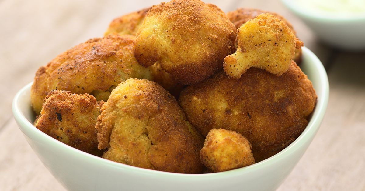5- صفي القرنبيط من الماء، غمسي كل قطعة قرنبيط بخليط البيض ثم غلفيها بخليط الكعك والنشاء وضعيها في طبق جانبا.