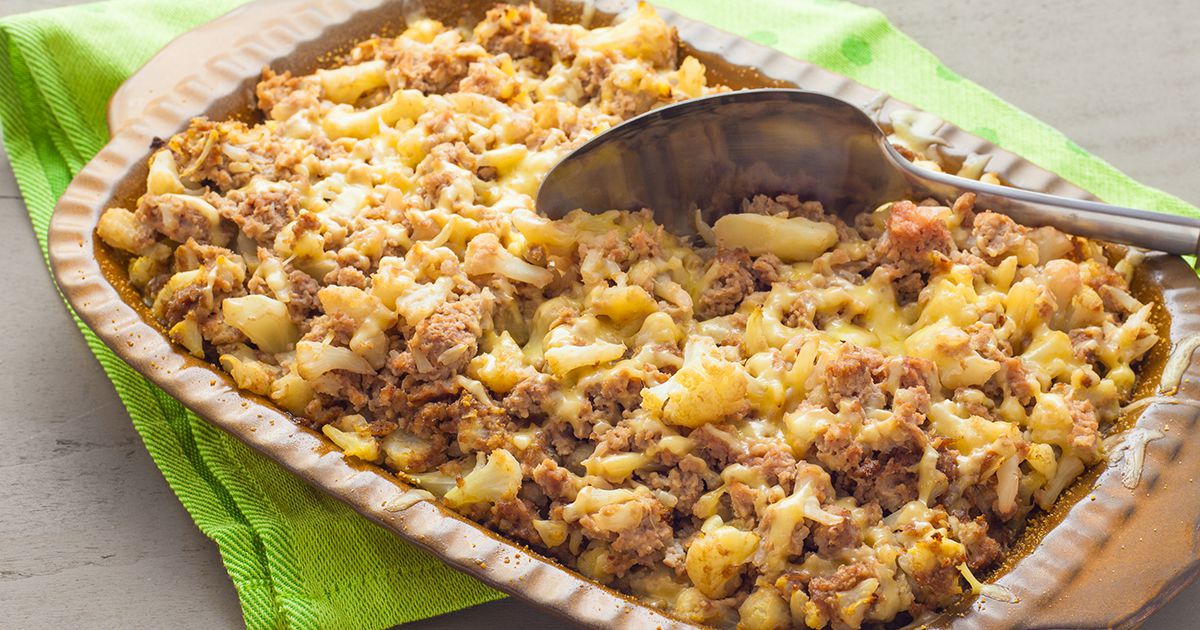 10- صفي القرنبيط من الماء وضعيه في صينية فرن. أضيفي على الوجه حشوة اللحم.