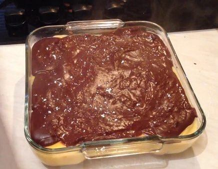 6. نضع الطبق جانباً بينما نحضر طبقة الكاسترد بالشوكولاته .