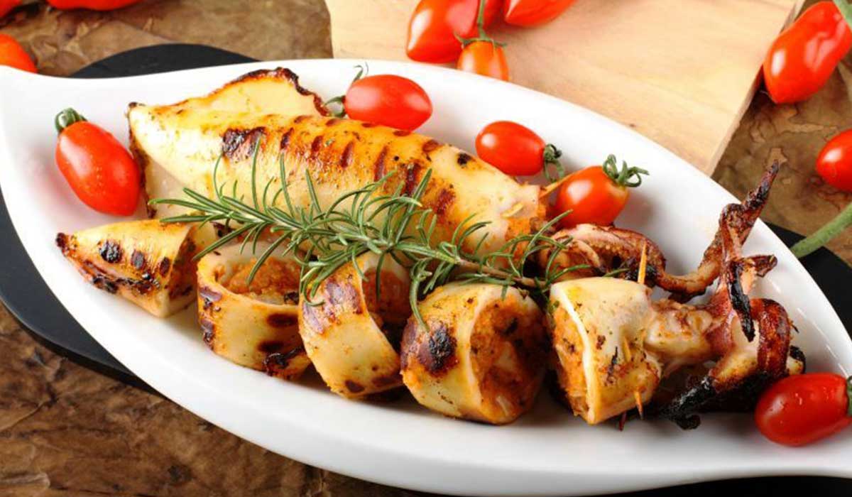 - نصف كوب من جبنة الحلوم المبشورة. 200 جرام جمبري مقشر ومنظف ومقطع. 3 ثمرات طماطم مقطعة. 1 حبة صغيرة بصل مقطع ناعم. 1 بيضة مخفوقة. نصف ملعقة صغيرة فلفل حار. نصف ملعقة صغيرة فلفل أسود المطحون. نصف ملعقة صغيرة زعتر مجفف مسحوق. 1 ملعقة صغيرة كزبرة مطحونة. 1 ملعقة صغيرة كمون مطحون. 1 مكعب مرقة دجاج. كوب وثلث ماء ساخن. 1 ملعقة كبيرة زيت زيتون. 600 جرام كاليماري نظيف. 3 فصوص ثوم مهروس. 1 ملعقة كبيرة عصير الليمون. 2 ملعقة كبيرة بقدونس مفروم طازج.