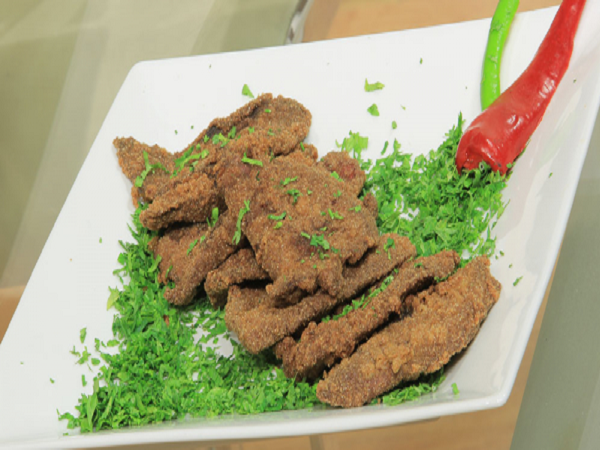 3. قلبى الكبدة المتبلة في الردة ثم قومى بقليها في الزيت.