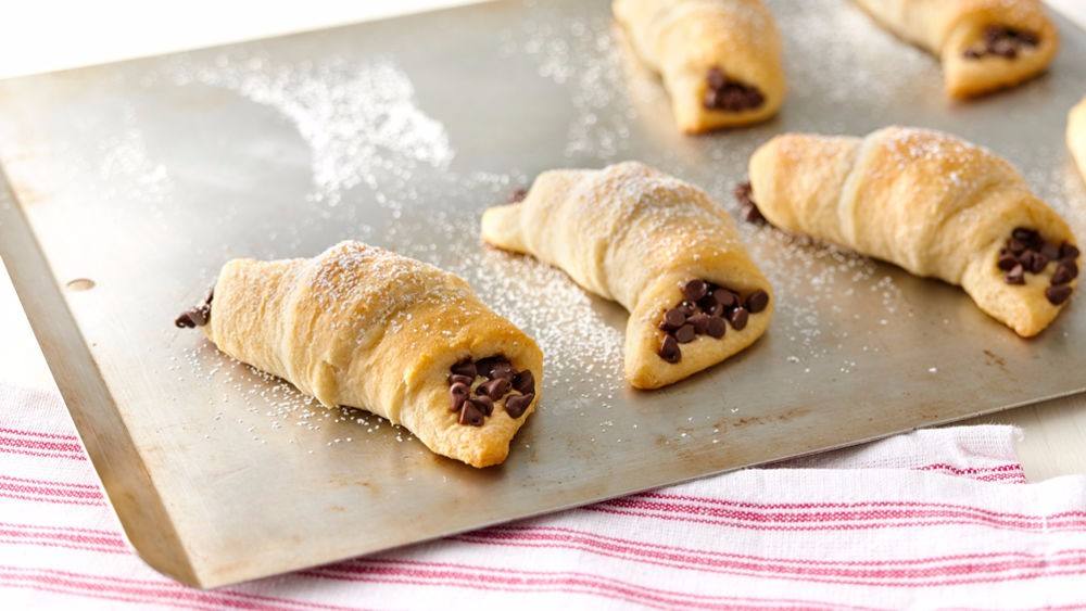 - ضعي الكرواسون المحشي بالشيكولاتة في طبق التقديم ثم زينية بالسكر البودرة و قدميه في الحال.