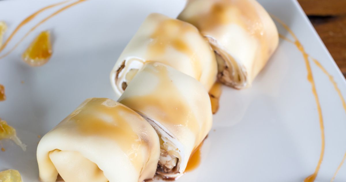 4- إدهني الكريب بشوكولاتة الدهن وأضيفي الموز. لفّي الكريب على شكل رول.