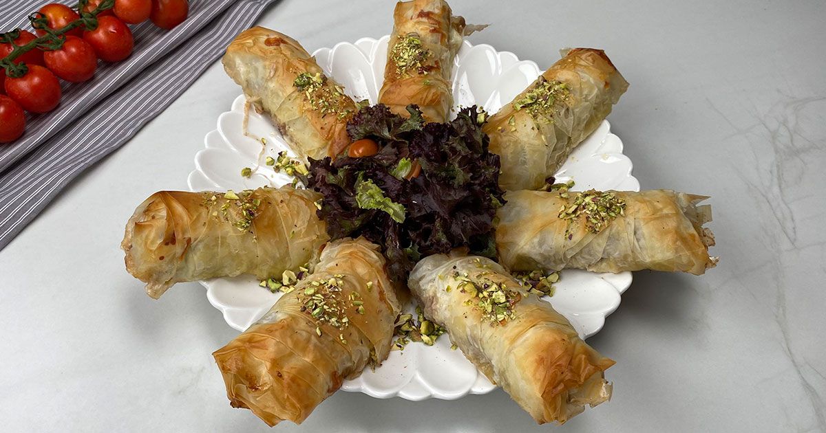 3- افردي ورقة من عجينة الفيلو وضعي قطعة من الكفتة مع القليل من الجبن في الوسط. لفّي العجينة على شكل رول. اعيدي الكرة حتى اتهاء الكمية.