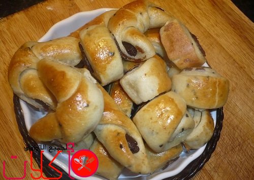 8- نجعل حشوة العجوة بشكل طولي ونضعها بداخل العجينة المرقوقة بشكل مستطيل نلف العجينة ليتشكل لدينا رول طويل نقطعه لقطع متساوية ونضعه في صينية الفرن المدهون بالقليل من الزيت