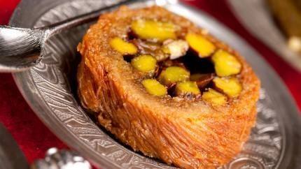- قومي بحشو قطع الكنافة بالفستق المحمّص ولفّيها بشكل دائري.