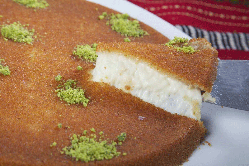 • 6 توضع الكنافة في الفرن لمدة 30 دقيقة إلى أن تتماسك الكريمة و تحمر الكنافة حتى الحواف، ثم أطفئي الفرن و ضعي الصينية تحت المشواة لدقيقة واحدة حتى يحمر سطح الكنافة و يصبح ذهبياً.
