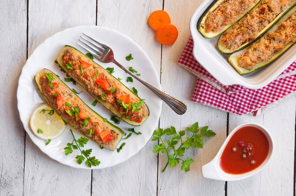 - قدمي الكوسة المحشية ساخنة مع السلطة.