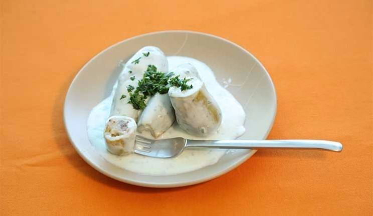 - توضع الكوسة في طبق التقديم، ويصب فوقها خليط الزبادي.
