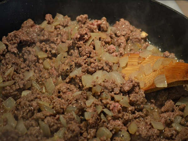 - تضيف زيت الزيتون إلى مقلاة على نار متوسطة، ثم اللحم المفروم، ونبدأ في التقليب جيدًا بملعقة خشبية حتى تنفصل قطع اللحم عن بعضها البعض.