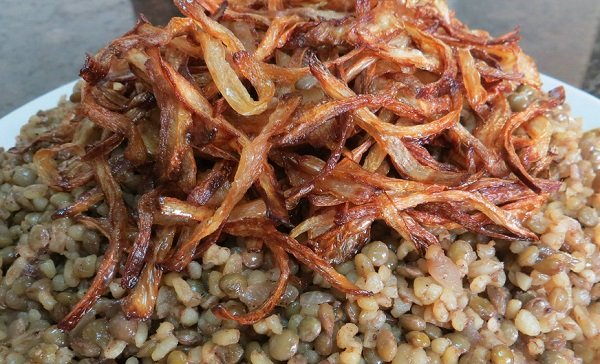 - ثم نضيف البصل إلى العدس ونقلبهما جيدًا.