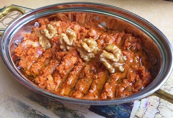 - نرتب الخليط في صحن التقديم ونزينه بالجوز وأوراق النعناع وزيت الزيتون وتصبح المحمرة جاهزة .