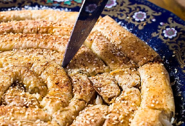7. عندما نخرجها من الفرن ندهنها بالعسل ثم نتركها تبرد تماماً ونرشها بالسكر الناعم والقرفة وبذور السمسم .