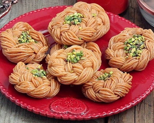 5. ننقل القطع لورق التنشيف لامتصاص الزيت الفائض منها، ثم نسكب عليها قطر الحلويات والفستق الحلبي ونقدمها بعد أن تبرد تماماً
