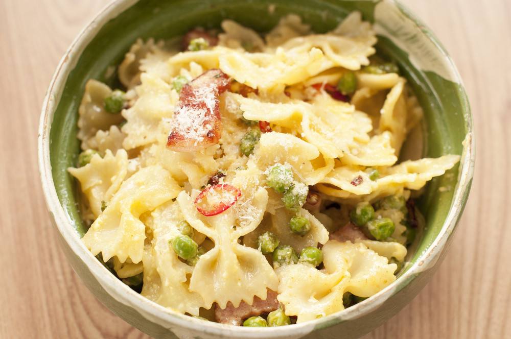 - ضعي البيكون في الصوص و قلبي ثم اضيفي البسلة و الجبن البارميزان و قلبي مرة اخرى.