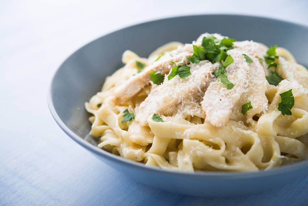- تضاف المكرونة اليها، ثم البصل والدجاج، وتقلب جيدا.
