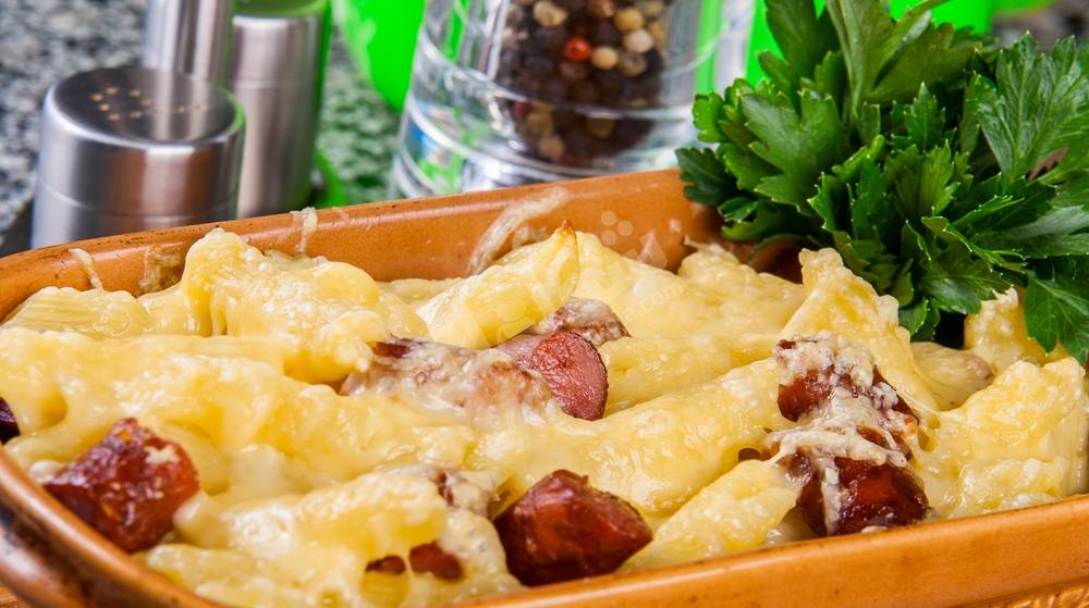 - ضعي المكرونة في صينية تستحدم في الفرن ثم ضعي السجق عليها و رشي علية جبن الموزاريللا.