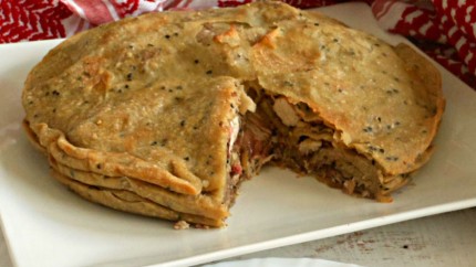 11- على الطبقة الخامسة، وزعي صدور الدجاج المقطعة ثم غطيها بطبقة أخرى من العجين وادهنيها بمزيج الزيت البصل.