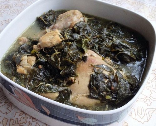 10. يضاف الدجاج فوق الملوخية ويقلب