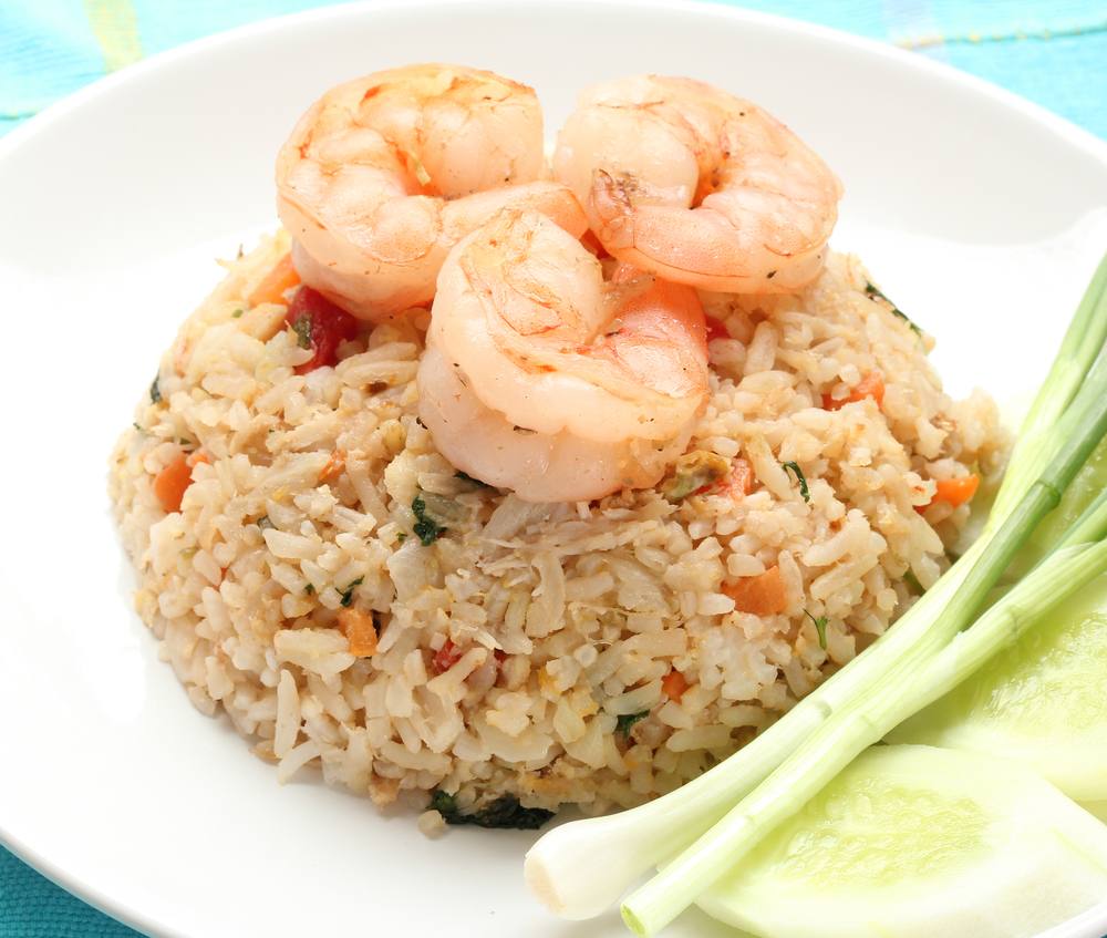 - يُرفع الروبيان ويُحمص الأرز لمدة 5 دقائق في نفس الوعاء، ثم تضاف البهارات والزعفران والمرق، ويُتبل بالملح حسب الرغبة.