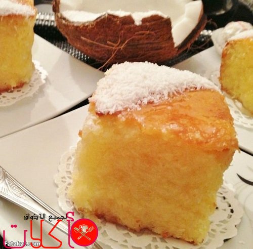 - ثم تقطع النمورة ويسكب فوقها القطر ونرش جوز الهند للتزيين .